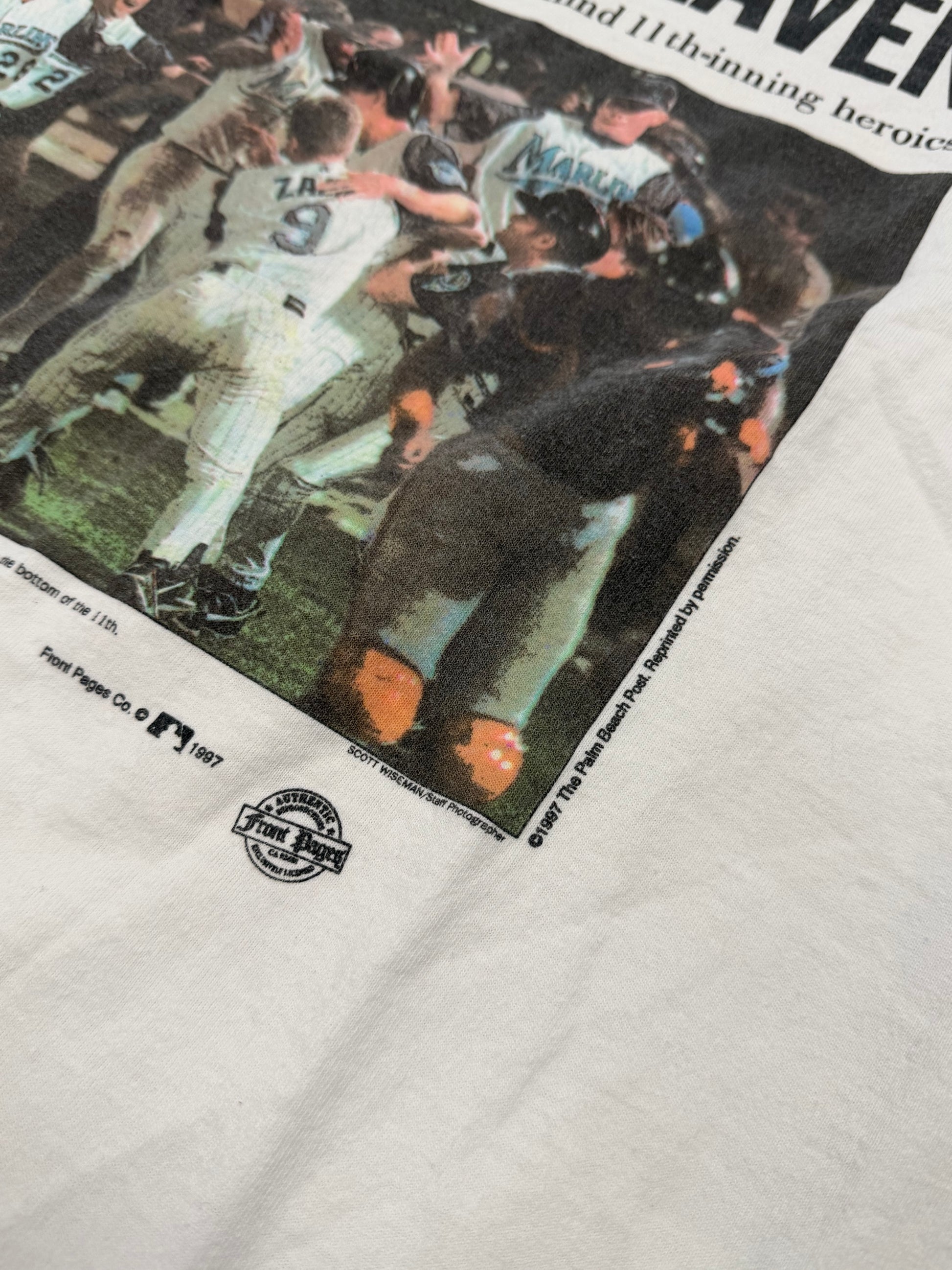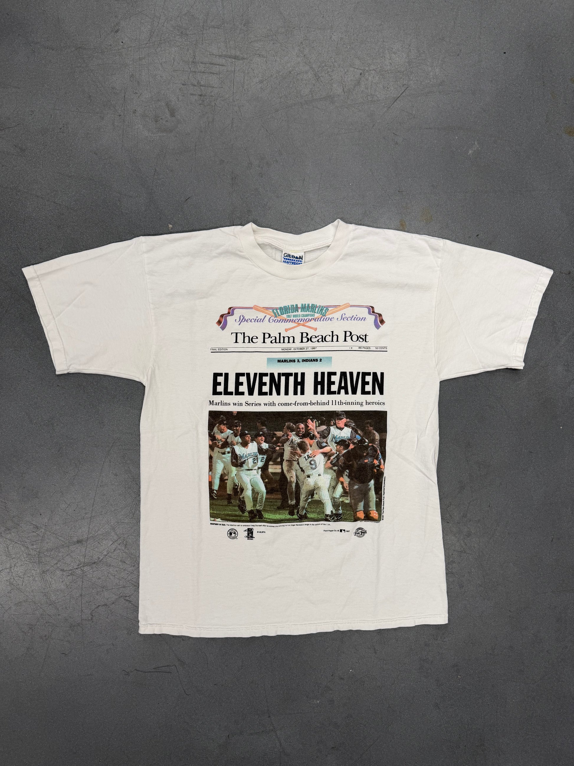 1997 FLORIDA MARLINS THE PALM BEACH POST ELEVENTH HEAVEN NEWSPAPER SHIRT (GILDAN ACTIVEWEAR TAG)