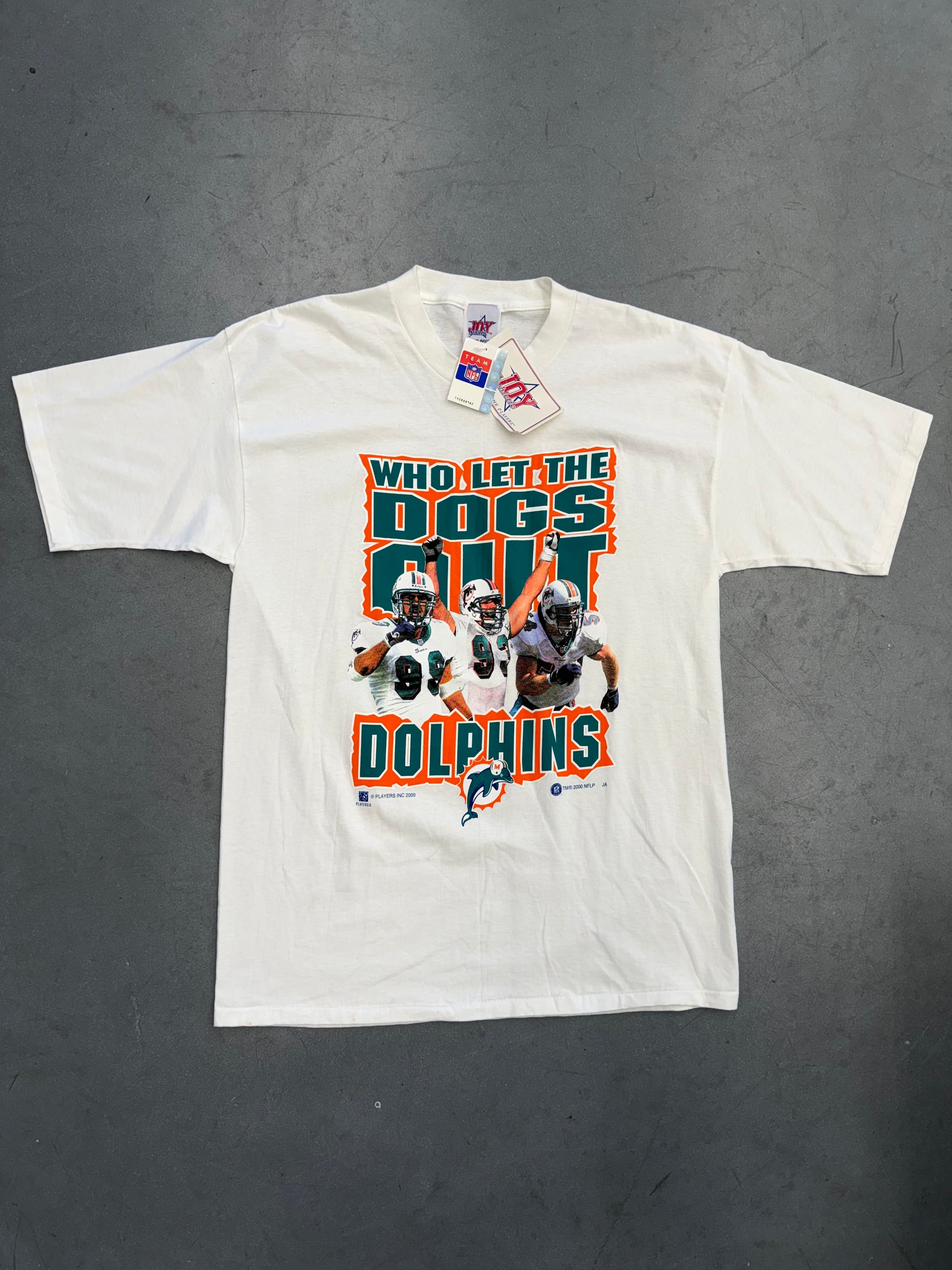2000 MIAMI DOLPHINS WHO LET THE DOGS OUT NFLP TEE (JOY ATHLETIC TAG) (NWT)