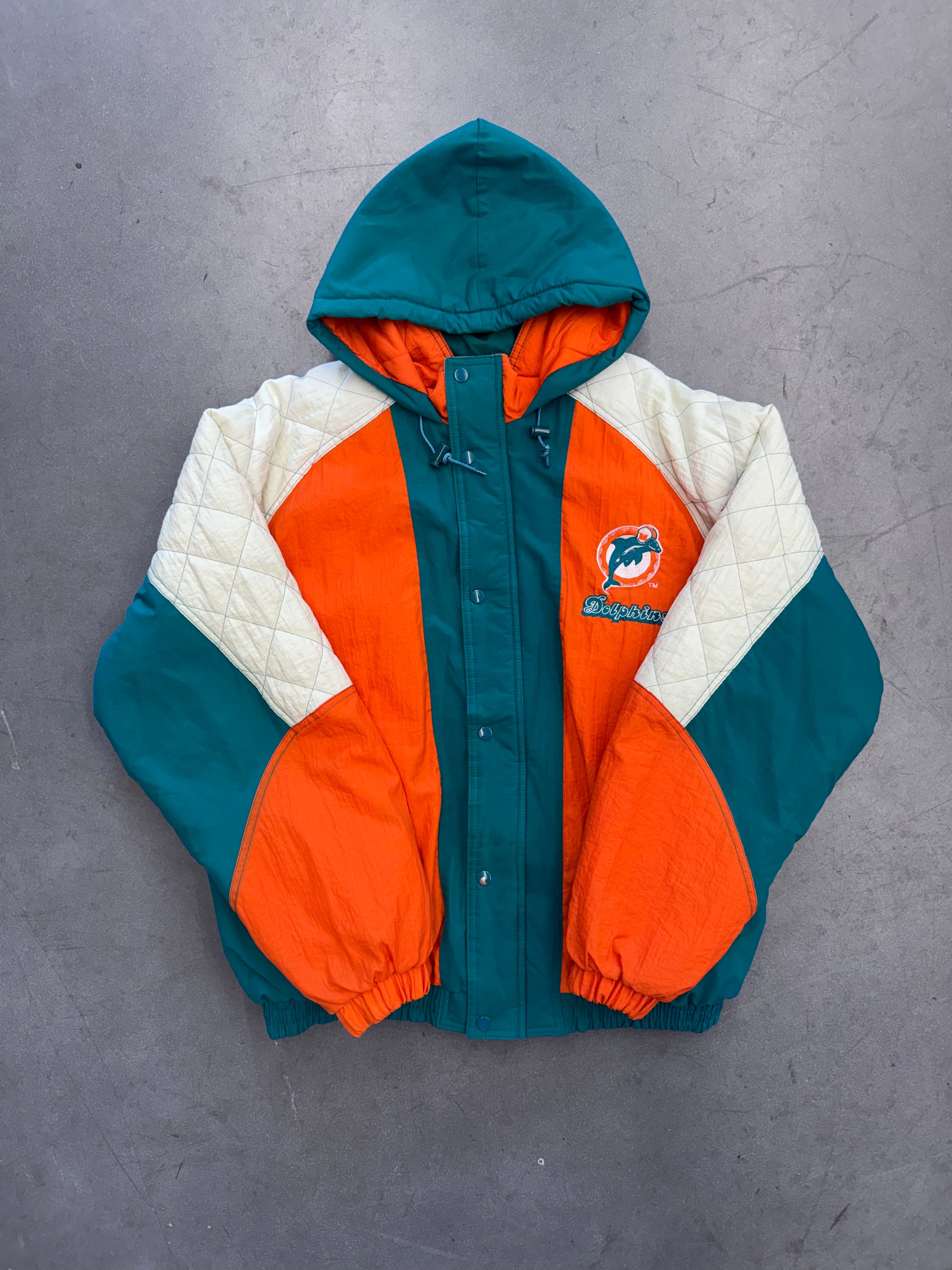 90'S STARTER MIAMI DOLPHINS DIAMOND PATTERN SLEEVE PUFFER JACKET (XL)